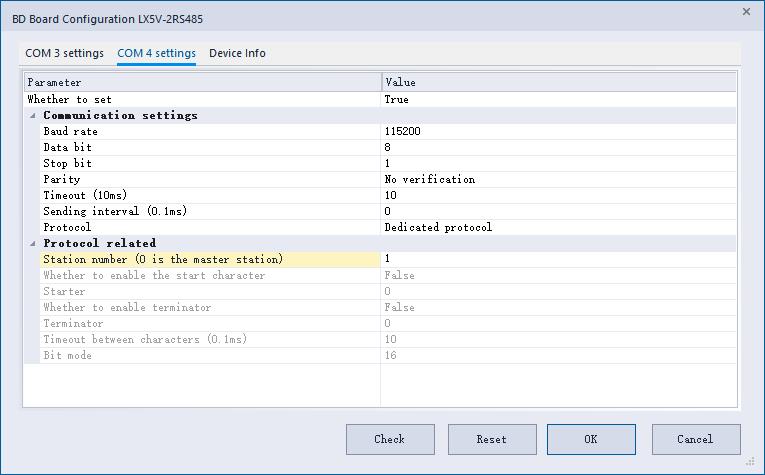 - After adding BD module to the machine slot, double-click or right-click to select configuration parameters to enter LX5V-2RS485-BD configuration parameters interface, as shown in the following figure. Parameters such as baud rate, data bit, stop bit, check bit and station number are configured in this interface.