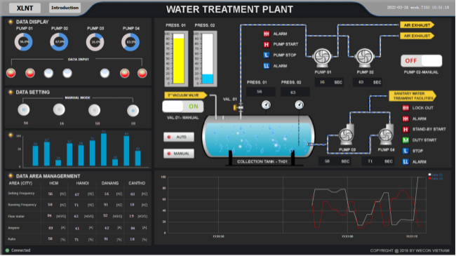 Industry introduction: water treatment system.Mainly to improve waterquality, to meet certain water quality standards, such as drinking water, industrial wastewater discharge.In order to ensure the stable operation of the water treatment system, it is necessary to monitor the water pressure and water level, and adjust the   appropriate water pressure and water level by remote control of the pumpspeed.